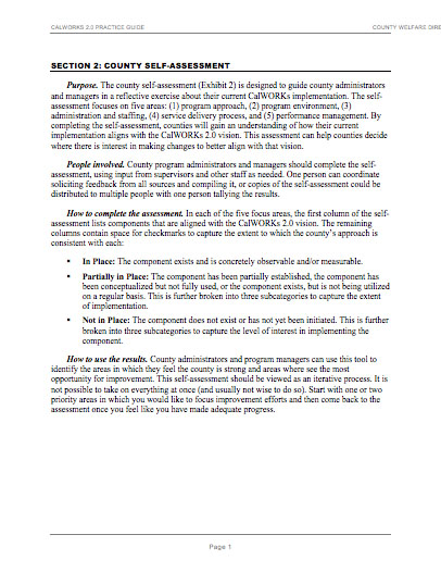 The county self-assessment is designed to guide county administrators and managers in a reflective exercise about their current CalWORKs implementation. It focuses on five areas: (1) program approach, (2) program environment, (3) administration and staffing, (4) service delivery process, and (5) performance management. By completing the self-assessment, counties will gain an understanding of how their current implementation aligns with the CalWORKs 2.0 vision.