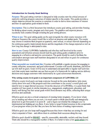 This is a brief document that introduces county goal setting, and provides framing for thinking about county, program and client goals. The graphics and stepwise process succinctly walk counties through initiating the goal setting process.