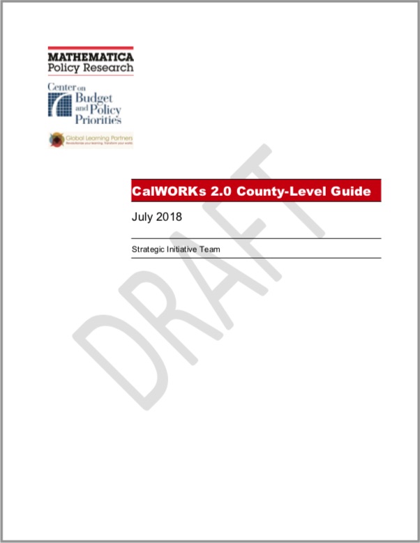 This guide is for county administrative staff. It describes the components of CalWORKs 2.0 and the constructs behind them, and provides instructions for using a set of tools in a regular county planning and improvement process. The guide includes two sections: Section 1 provides background on the underlying concepts of CalWORKs 2.0; Section 2 provides directions on how to use the CalWORKs 2.0 framework.